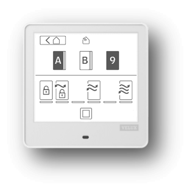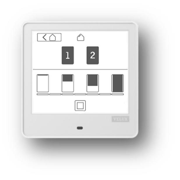Remarque : selon les produits copiés sur VELUX Touch, toutes les catégories peuvent ne pas être affichées. - Sélectionnez le produit/groupe à utiliser en appuyant sur l'icône au-dessus de la ligne horizontale. Pour contrôler plusieurs produits simultanément, appuyez sur une combinaison de produits et/ou de groupes.